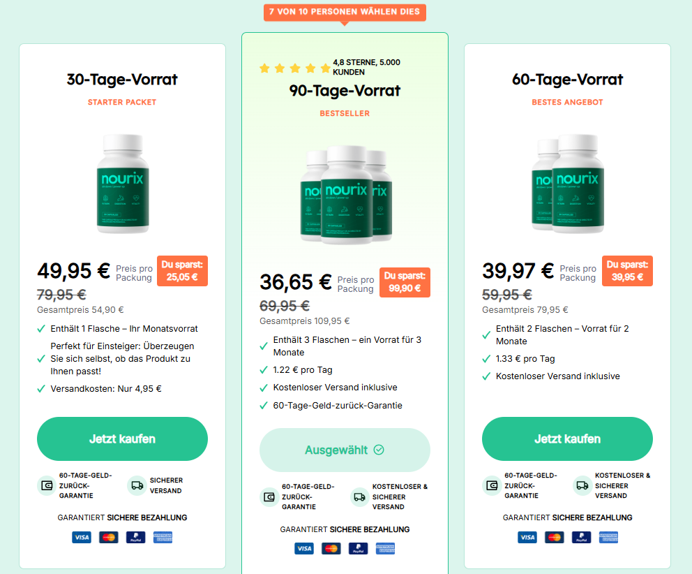 ✅Nourix wird nur über die offizielle Website verkauft. Beim Kauf außerhalb der offiziellen Website steigt das Risiko, gefälschte oder abgelaufene Produkte zu erwerben. Auf der Website profitieren Sie außerdem von einer Zufriedenheitsgarantie und exklusiven Aktionen.